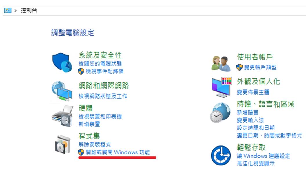 控制台點選開啟或關閉Windows功能